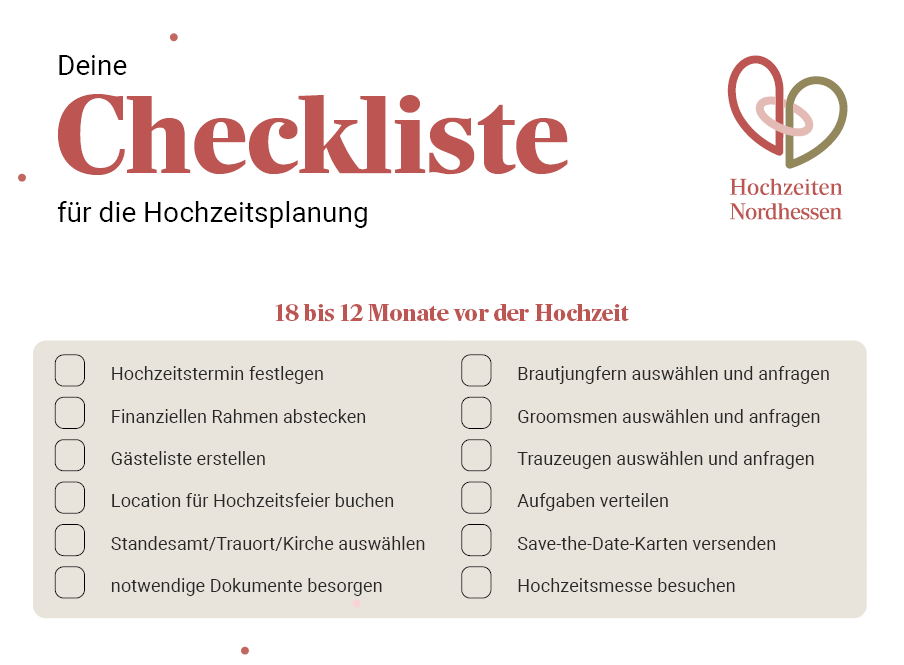 Zunächst solltet ihr jetzt die Eheschließung beim Standesamt anmelden, sofern das noch nicht erledigt wurde. Informiert Euch frühzeitig, welche Unterlagen ihr benötigt und ob Euer Wunschdatum schon reserviert werden kann.