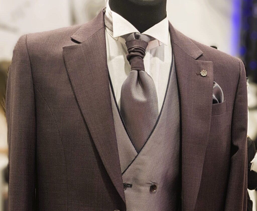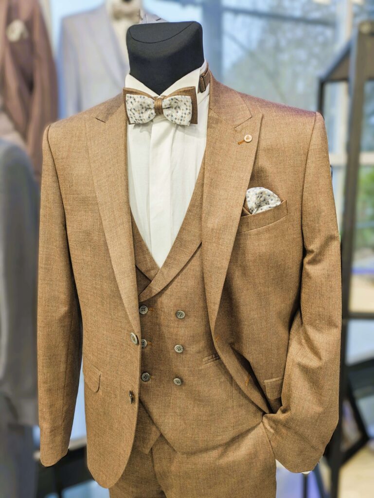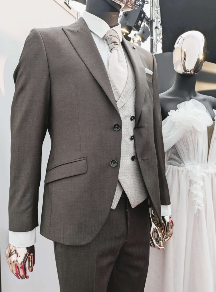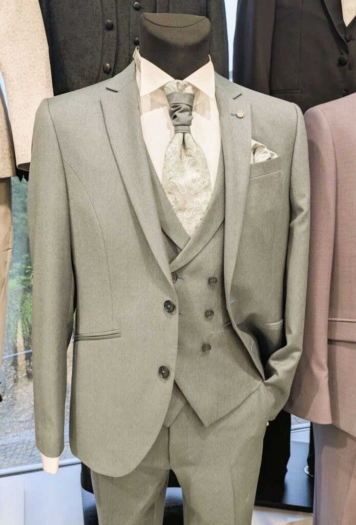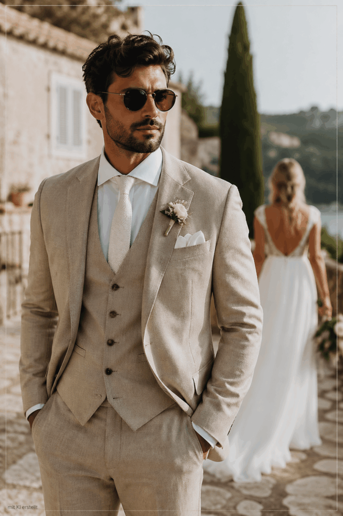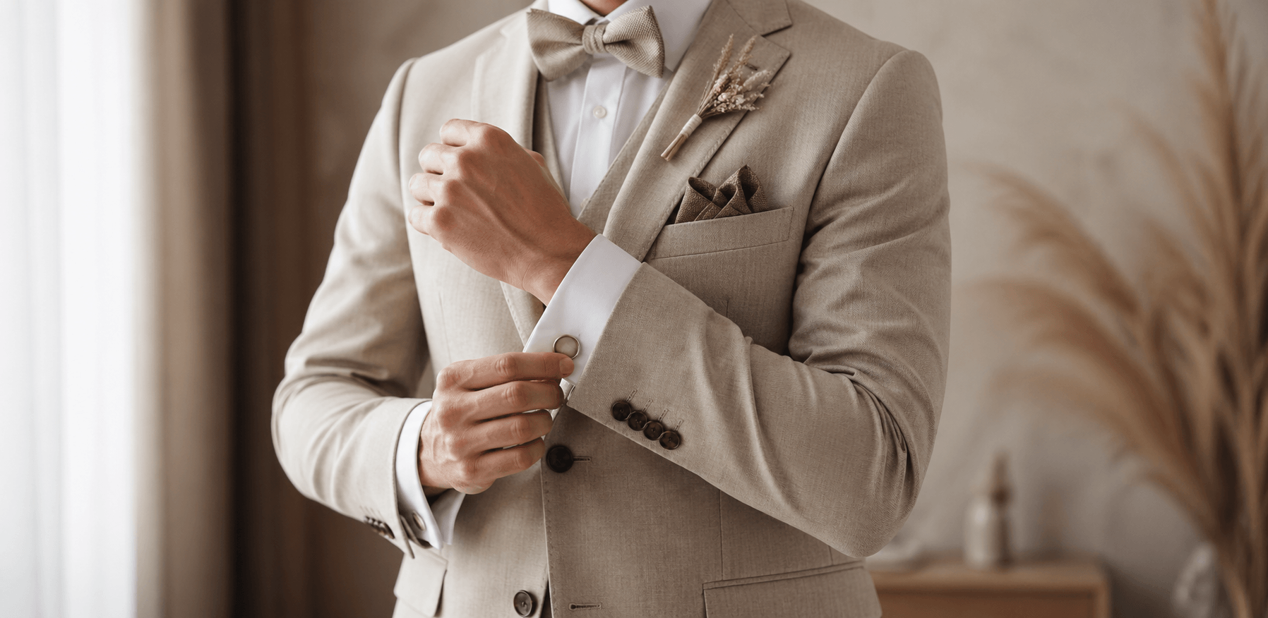 Farblich verabschieden wir uns vom klassischen Schwarz als Standard: Warme Naturtöne wie Sand, Beige, Taupe und Salbeigrün liegen voll im Trend. Auch gedeckte Blautöne sowie sanfte Pastellnuancen wie Dusty Blue oder Rosé bleiben beliebt – vor allem bei Sommerhochzeiten. Für mutigere Bräutigame eignen sich Terrakotta oder dunkles Bordeaux als stilvolle Statement-Farben.