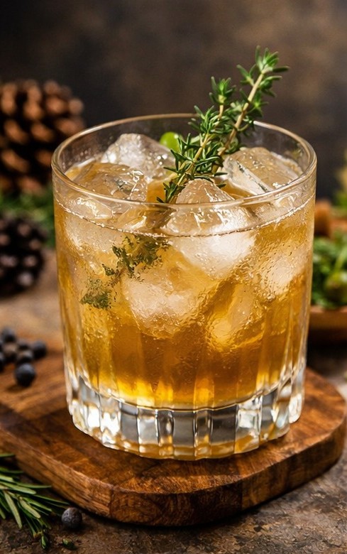Alle Zutaten auf Eis kräftig shaken. In einen Tumbler auf großem Eiswürfel abseihen. Mit Thymian garnieren.